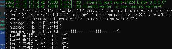 private static final FluentLogger loggerf = FluentLogger.getLogger("fluentd"); loggerf.log("test", "message", "Hello Fluentd");console에서 확인