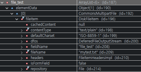 serialize()할 수 없어서 json 으로 변경되는것을 무시하기위해 @jsonIgnore를 사용해준다. 나는 mytest.txt파일을 업로드 해보았다. 여기까지 지정하고 controller에서 확인해보면 값이 넘어온것을 확인할 수 있다.debug 그리고나서 항간에 많이 돌아다니는 파일업로드 로직을 사용해서 처리해준다.