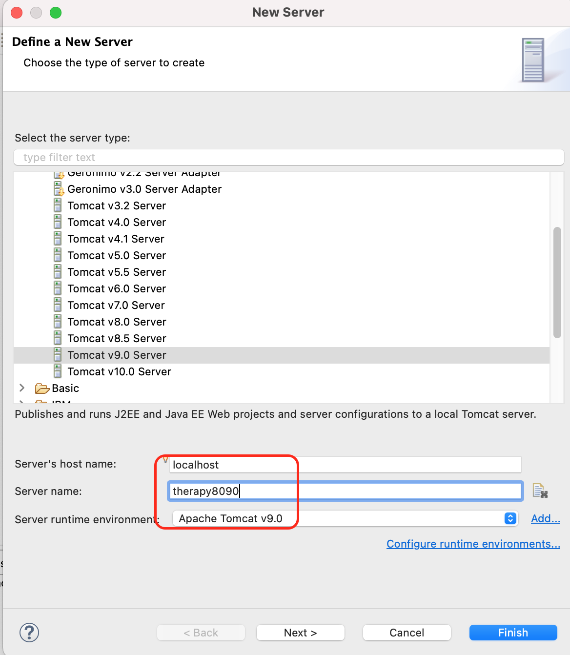 6. 원하는 톰캣 버전을 선택하고 서버 이름을 지어줍니다. (저는 8090포트에서 돌릴것이라 이름에 옆에 써주었습니다. )