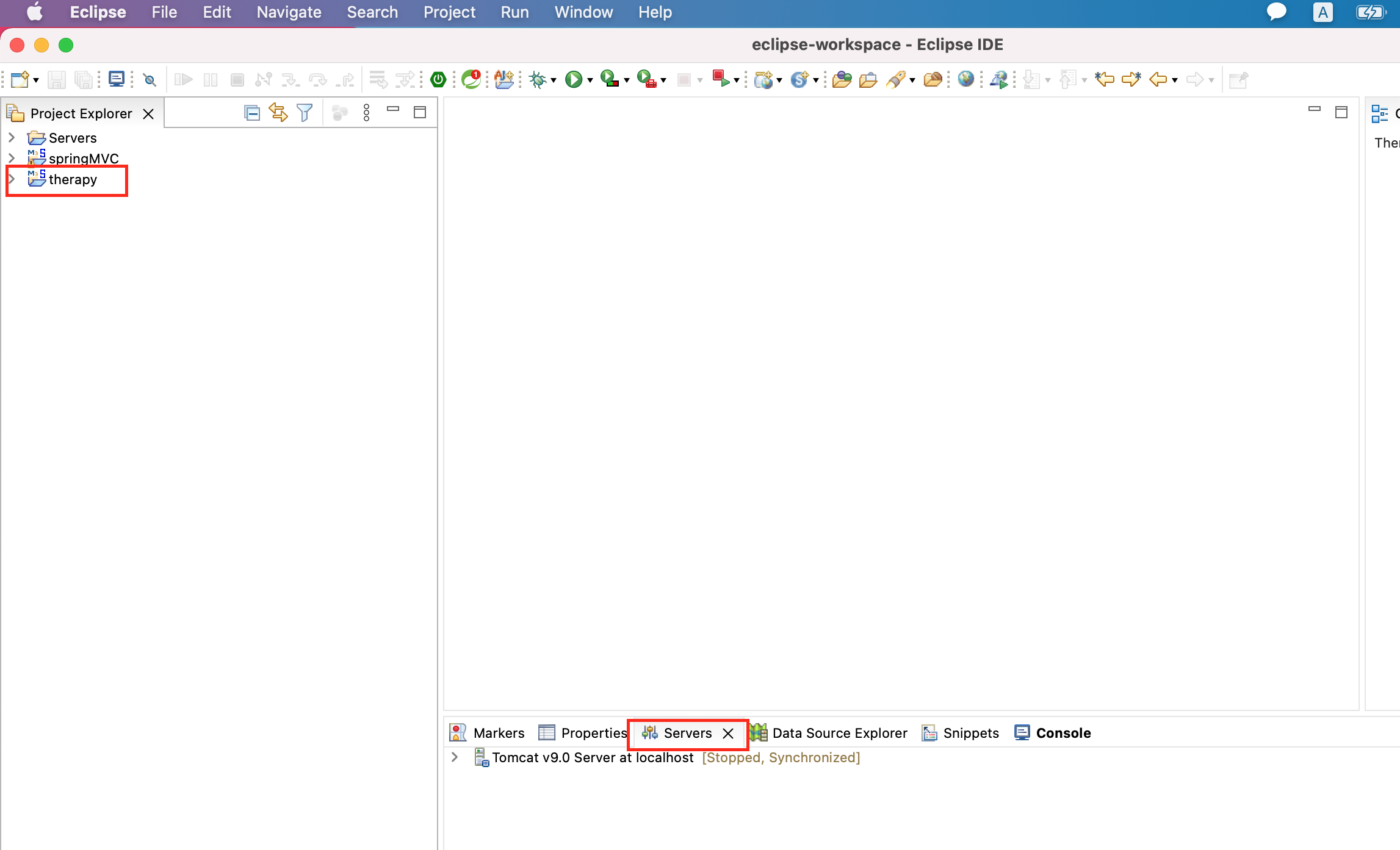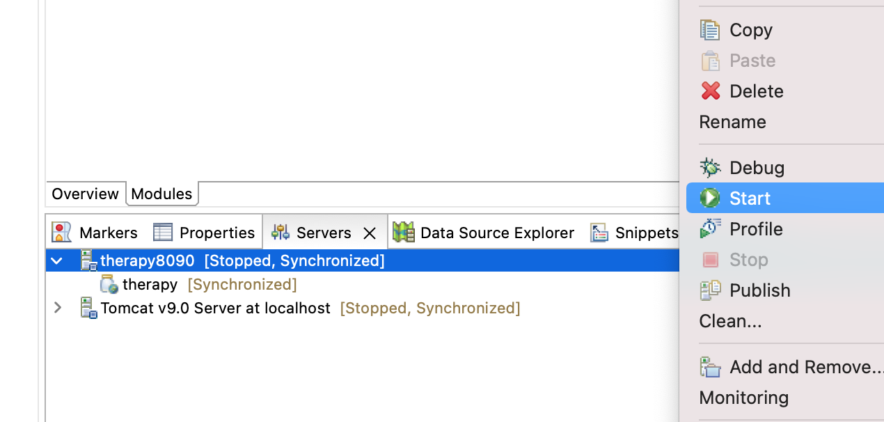 9. 서버에서 오른쪽 마우스 클릭해서 start 해줍니다. 그리고 브라우저의 url 에 http://localhost:8090/therapy 를 입력해줍니다. therapy 는 저의 project 명입니다.