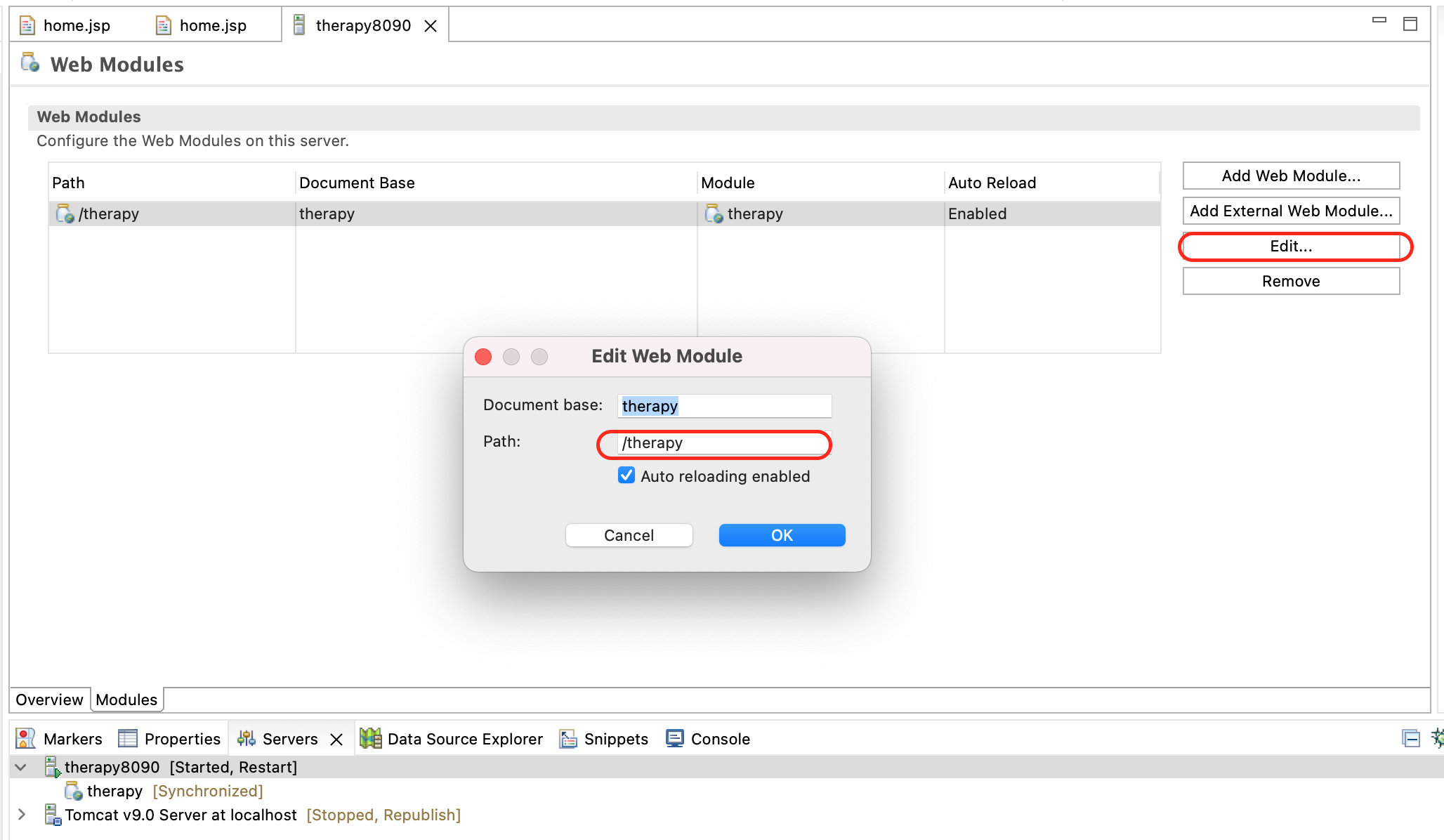 서버 - modules 탭에가서 path를 /therapy -> / 으로 변경해준다. 그리고 저장하고 서버를 다시 재시작하여 확인해본다.