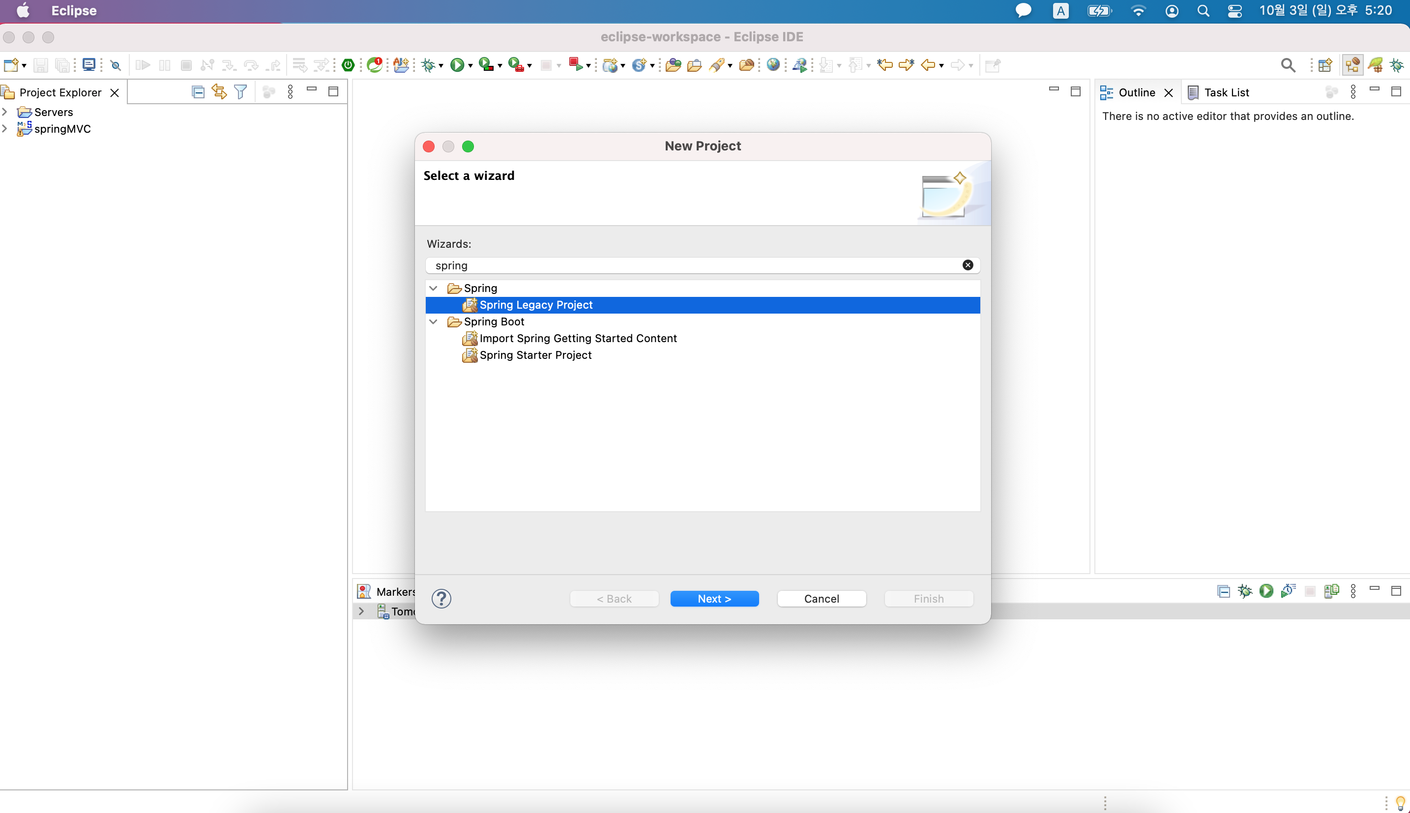 오늘은 이클립스에서 스프링프로젝트를 하기위해 spring legacy project를 생성하고 tomcat을 추가하고 화면 띄우는 것 까지 진행해보겠습니다.