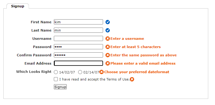 앞서 포스팅 했던것 처럼 비슷하게 js로 유효성 검사를 구현할 수 있지만 미리 만들어져 있는걸 쓰고싶다면 jQuery Validation Plugin 이 있습니다. 상단 이미지와 같이 나오게 할 수 있으며 demo 페이지가 많으니 (https://jqueryvalidation.org/files/demo/milk/) 직접 경험할 수 있습니다.