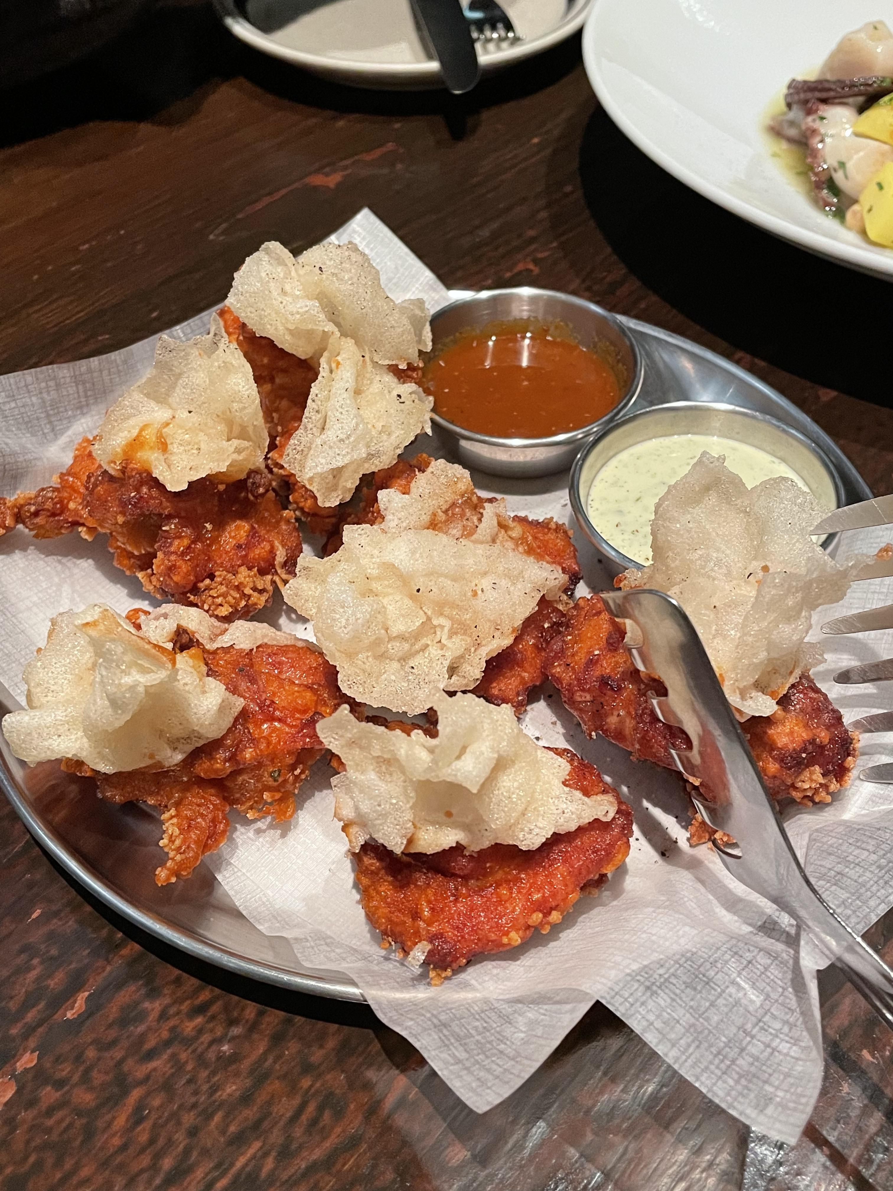 시그니처 메뉴 박찬일식 닭튀김 위에 하얀건 라이스 페이퍼~ 우리가 아는 치킨의 맛이다 + 약간의 부드러움 +라이스 2만 3천원~~